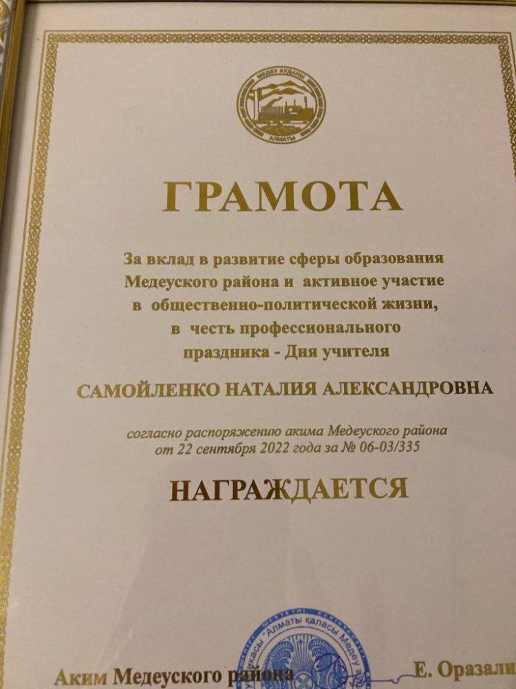Поздравляем учителя музыки Даулбаеву К.Г. с наградой акима Медеуского района