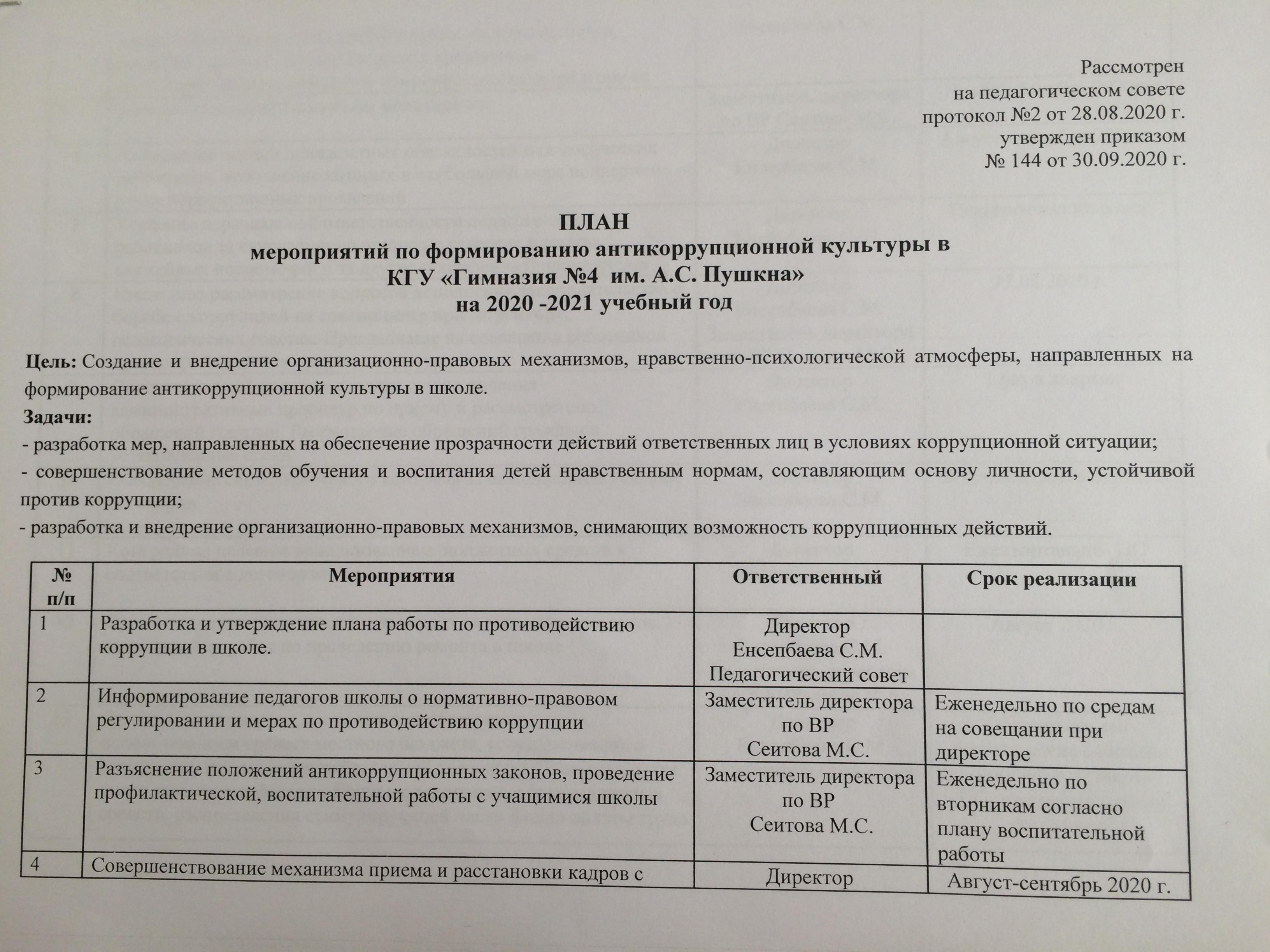 30 қазан 2020 0 1 2 3 4 5 План по формированию антикоррупционной культуры в КГУ "Гимназия №4 им.А.С.Пушкина" на 2020-2021 у.г.