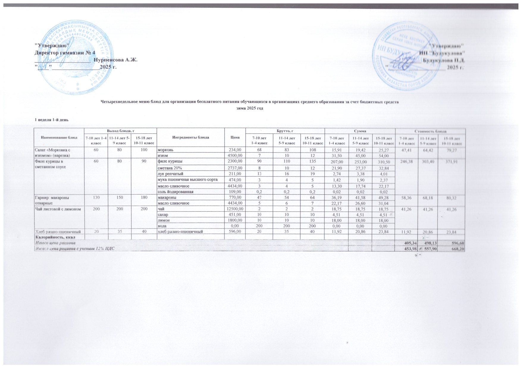 01 желтоқсан 2025 0 1 2 3 4 5 Четырехнедельное меню блюд для организации бесплатного питания обучающихся в организациях среднего образования